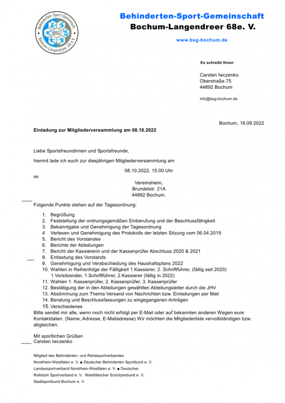 Einladung zur Mitgliederversammlung am 08.10.2022