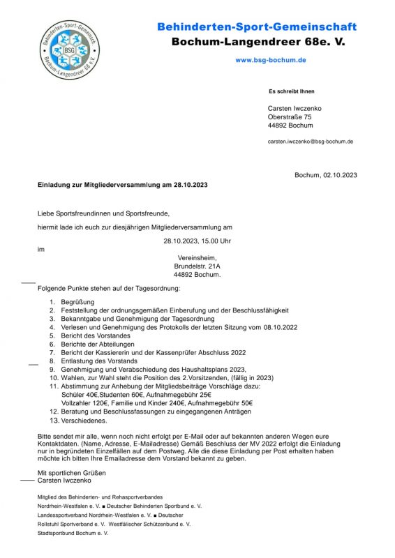 Einladung zur Mitgliederversammlung am 28.10.2023